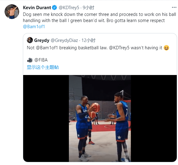 赛后,杜兰特转发了某个记者的社交动态,并批评阿德巴约不尊重人,阿德巴约也回击,杜兰特应该去找利拉德拿球,可是他不敢,他只敢以大欺小,为了表示自己的愤怒,阿德巴约还用了一个竖中指的表情。最终还是利拉德一番:别屁大点事都放在网络上。这场骂战这也才消停。