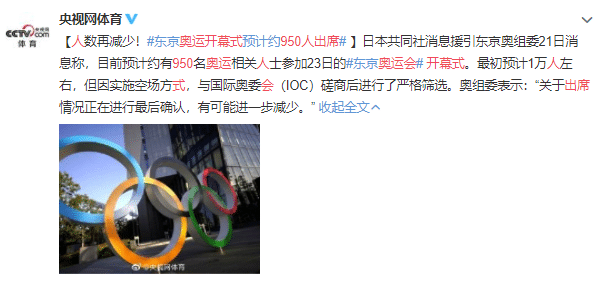 据日本共同社报道,东京奥组委21日透露,预计将有950人参加7月23日的东京奥运会开幕式,最初预计1万人左右,但因疫情实施空场的方式,与国际奥委会(IOC)磋商后进行了严格筛选;奥组委表示:关于出席开幕式的情况正在进行最后确认,有可能进一步减少。