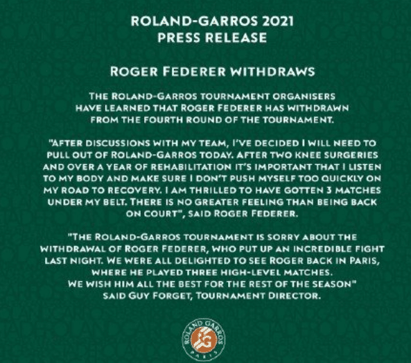 费德勒退赛声明写道:“在经过与团队协商之后,我已经决定需要退出法网剩余的比赛。经过了两次膝盖手术和超过一年的恢复期之后,听从身体的意见非常重要,确保不会在复出道路上让自己冲得太快。我很兴奋能拿到三场胜利,没有什么感觉是比重返赛场更棒的了。”