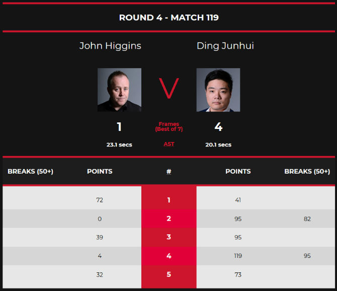 查看:丁俊晖vs希金斯 全场录像回放数据统计: