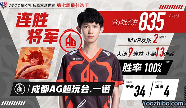 第七周最佳选手为成都AG超玩会.一诺。成都AG超玩会第七周中拿下两个三比零豪取九连胜率先锁定季后赛,一诺无疑是最强助力之一。在第七周比赛中6局比赛,一诺拿下2次MVP,他的击杀数高达34位列联盟第三,上演4次单杀位列联盟第二,是当之无愧的击杀王。同时一诺的分均经济高达835位列联盟第一,Gank击杀率高达40%位列联盟第三,在第七周对阵DYG的比赛中,一诺娜可露露天秀收割,多次上演单杀秀,对阵重庆QG的比赛中裴擒虎超神Carry,帮助队伍拿下胜利。