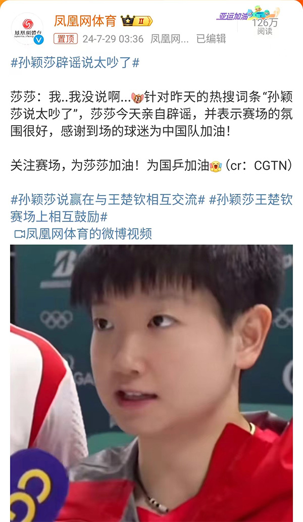 孙颖莎巴黎奥运首战辟谣:“吵死了”系乌龙
