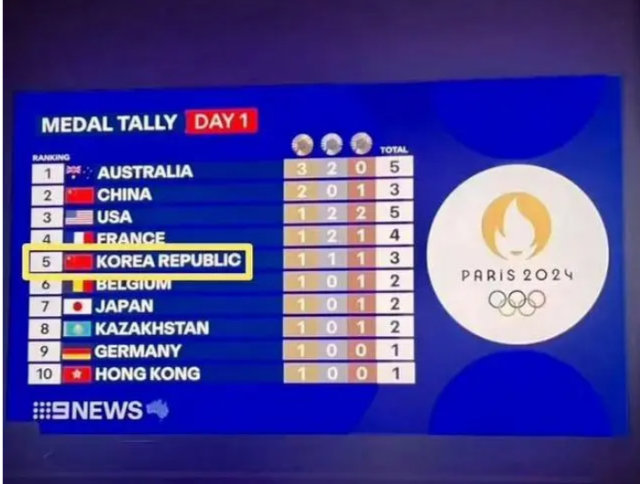 这边道完歉,法国奥组委针对韩国的举措是一个接一个,比如说开幕式韩国被虚化了,观众看不清楚韩国国旗和韩国代表队的运动员。在比如说在金牌榜上韩国运动员的国旗被标注成了南非了。比如说韩国队射箭拿到了亚军,但是国旗却比季军更低。