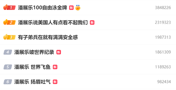潘展乐夺冠引热议,“潘展乐100自由泳金牌”、“潘展乐说美国人有点看不起我们”、“潘展乐破世界纪录”、“潘展乐 世界飞鱼”、“潘展乐 扬眉吐气”都冲上热搜榜,其中夺得金牌位居热搜榜第一位。