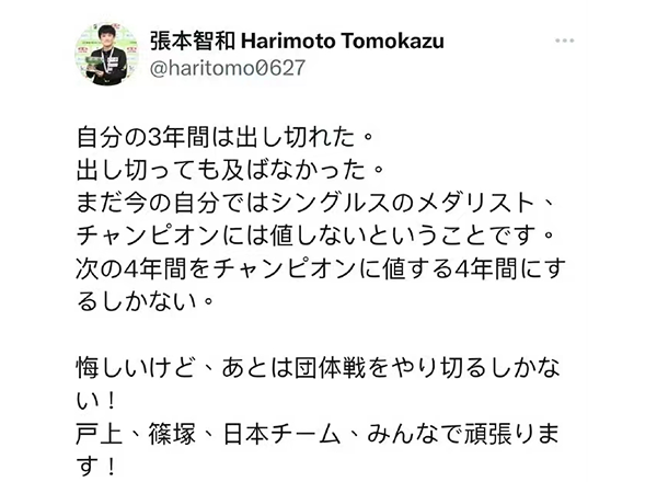 张本智和更新社媒发文写道:我充分利用了这三年的时间。即使我付出了我的一切,但这还不够。到目前为止,我还没有资格成为单打奖牌得主或是冠军。