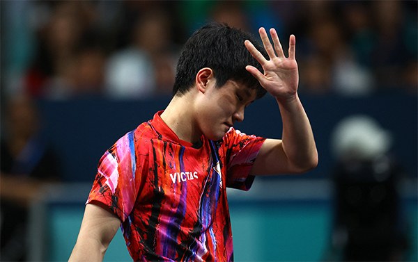 在巴黎奥运男单1/4决赛,张本智和在2-0领先的情况下被樊振东逆转,第七局决胜局,7-7之后樊振东连得4分拿下比赛,小胖4-3逆转晋级四强,赛后张开双臂庆祝胜利,张本智和蹲在原地遗憾流泪;接受采访时,张本智和表示他非常不甘心,还直言:樊振东比我更顽强,希望他能走到最后。