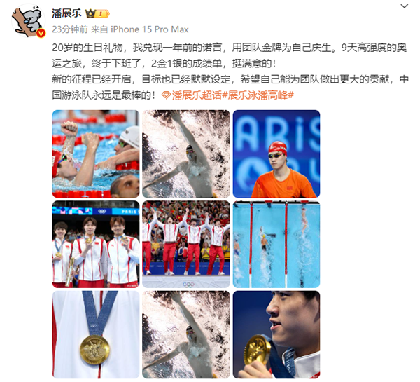 潘展乐晒夺冠照并且写道:20岁的生日礼物,我兑现一年前的诺言,用团队金牌为自己庆生。9天高强度的奥运之旅,终于下班了,2金1银的成绩单,挺满意的!新的征程已经开启,目标也已经默默设定,希望自己能为团队做出更大的贡献,中国游泳队永远是最棒的!