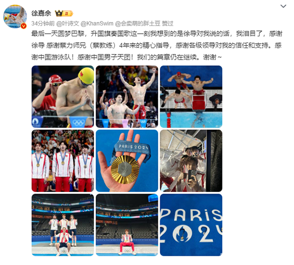 徐嘉余晒夺冠照并写道:最后一天圆梦巴黎,升国旗奏国歌这一刻我想到的是徐导对我说的话,我泪目了,感谢徐导 ,感谢蔡力师兄(蔡教练)4年来的精心指导,感谢各级领导对我的信任和支持。感谢中国游泳队!感谢中国男子天团!我们的篇章仍在继续。谢谢