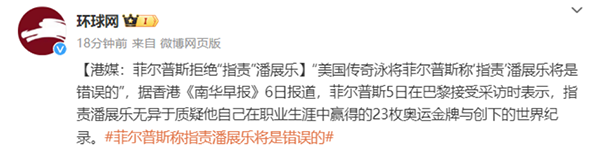 曾经质疑潘展乐纪录的菲尔普斯,在后来的采访中改口了。他还把潘展乐的成绩和自己的生涯表现联系在一起。
