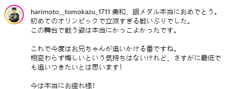 24直播网讯 北京时间8月11日,日本乒乓球运动员张本智和在社媒晒出与妹妹的合影,配文写道:祝贺美和赢得银牌!你在首次奥运的表现太好了,能看到你在这个舞台战斗真的很棒。现在轮到你的大哥来追赶你了;我没有遗憾,但我至少想要赶上来!你做得真棒!