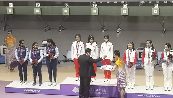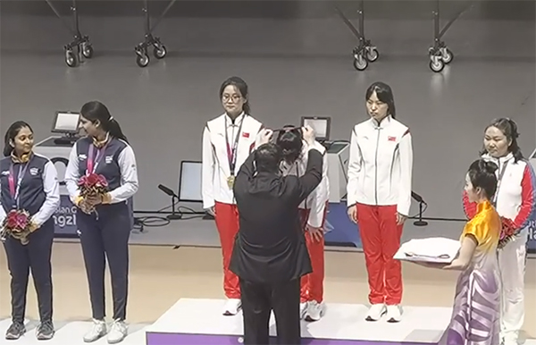 比赛结束之后的颁奖仪式,中国射击传奇王义夫亲自颁奖,参加过6届奥运会的王义夫已经63岁了,他也曾经在亚运会夺得过金牌,如今给三位中国队的小将颁奖,也是一种传承。