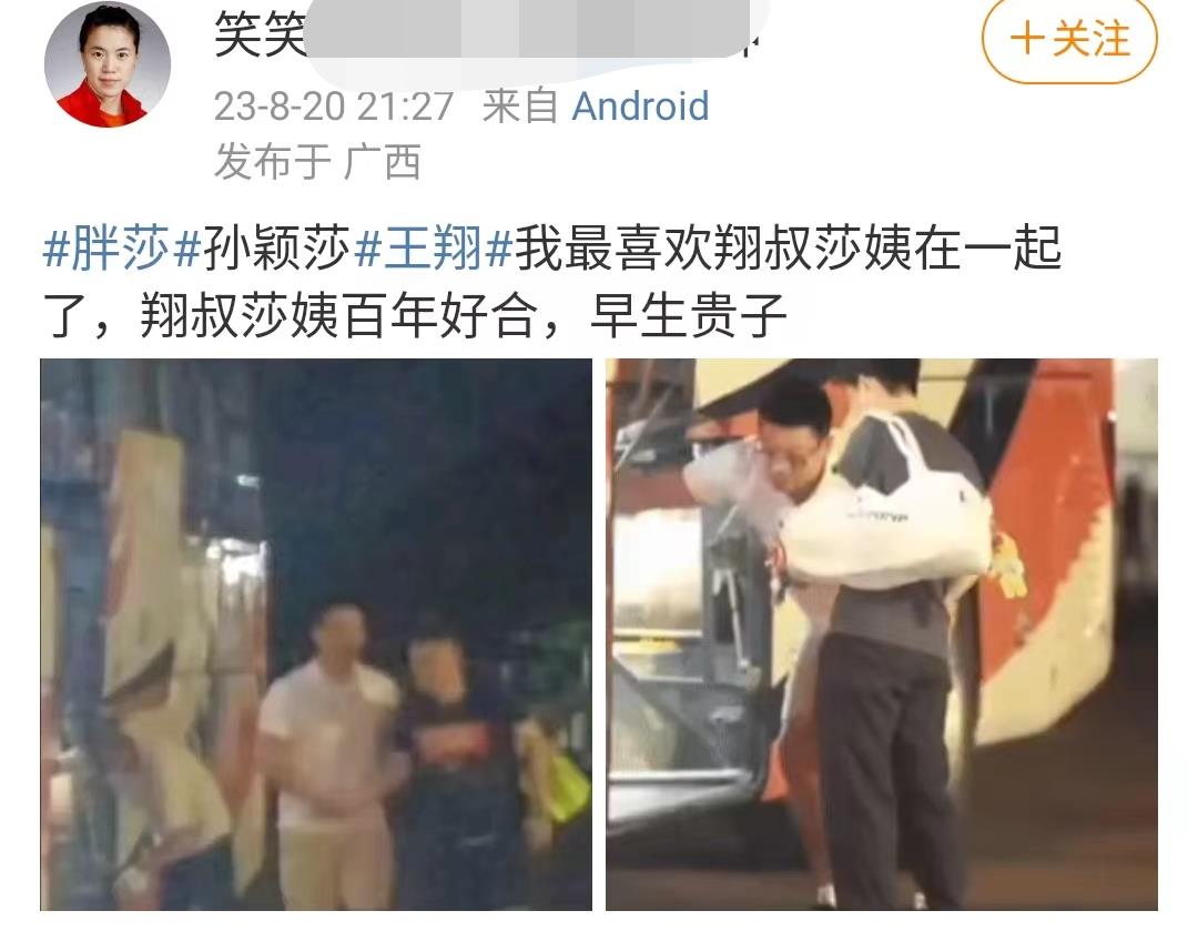 孙颖莎这边是什么情况呢?孙颖莎这一波的恋情传闻完全是由一张孙颖莎和体能训练师王翔的牵手照。这张照片是孙颖莎出发比赛,体能师王翔帮助孙颖莎把行李放到大巴上,随后,王翔和孙颖莎握手再见。或许是因为还有事情没有说完,孙颖莎也是和王翔一边握着手一边往前走,而这张照片也被CP粉认为是孙颖莎和王翔无疑曝光的拉手,CP粉也认为这是两者恋情的官宣,甚至有的球迷还表态喜欢:翔叔和莎姨在一起,祝百年好合,早生贵子。