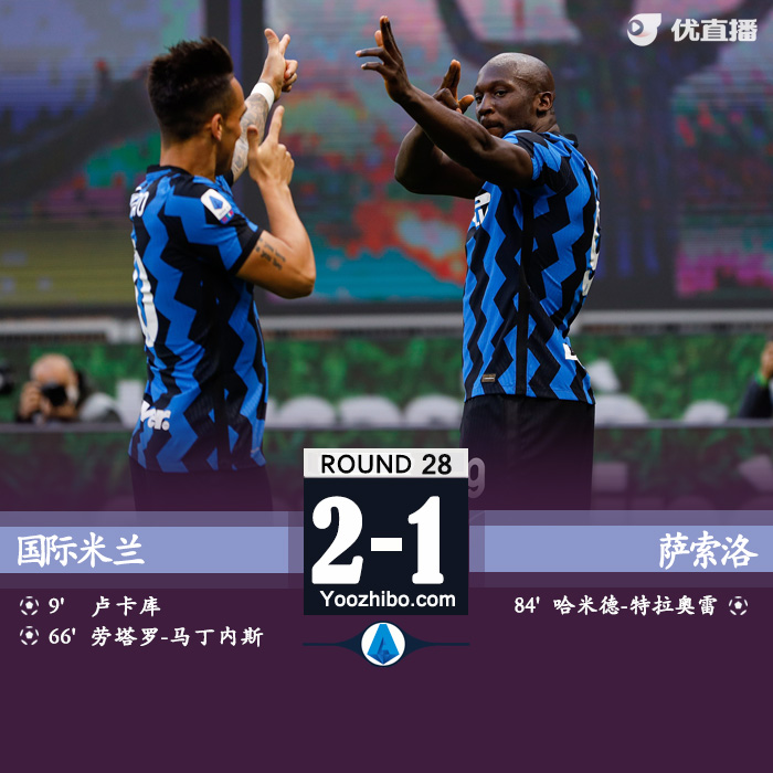北京时间4月8日凌晨0时45分,2020-2021赛季意甲联赛第28轮的一场补赛展开角逐,国际米兰坐镇主场迎战萨索洛。上半场,阿什利-扬助攻卢卡库破门。国米半场1-0领先。下半场,卢卡库送出助攻,劳塔罗-马丁内斯破门,随后特劳雷为萨索洛扳回一城。最终国际米兰主场2-1击败萨索洛。此役结束后,国际米兰取得意甲10连胜,继续排名榜首,领先第二名AC米兰多达11分。