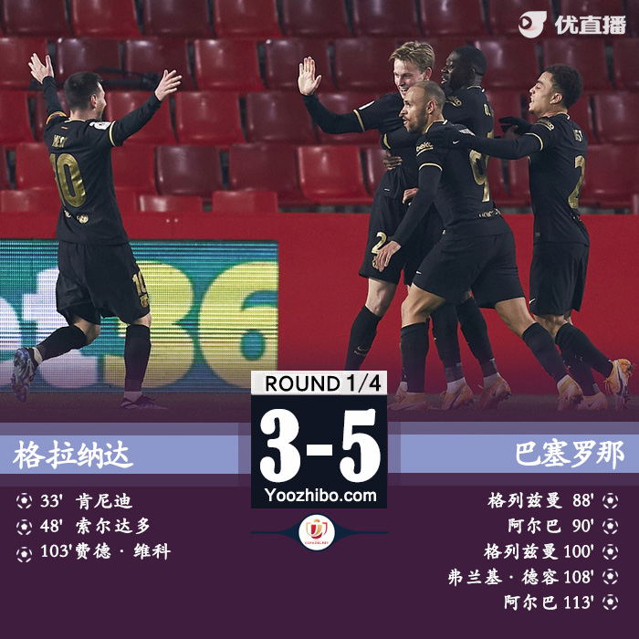 北京时间2月4日凌晨4点整,2020-21赛季西班牙国王杯1/4决赛展开角逐,巴塞罗那客场挑战格拉纳达。上半场乌姆蒂蒂失误送礼,肯尼迪首开纪录,下半场索尔达多单刀破门,罗贝托伤退,巴萨三中框,格列兹曼和阿尔巴扳平比分。加时赛格列兹曼、德容和阿尔巴先后破门,最终巴塞罗那客场5-3战胜格拉纳达,巴萨晋级国王杯四强。