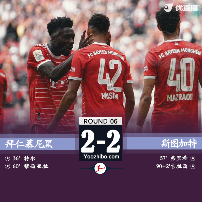 北京时间9月10日21:30,德甲第6轮,拜仁慕尼黑主场迎战斯图加特。上半场,基米希主罚任意球稍稍打高,特尔门前包抄被扑错失良机,阿方索-戴维斯助攻特尔打入德甲处子球。下半场,弗里希反击扳平比分,穆西亚拉低射破门助拜仁超出比分,格纳布里错失单刀,德里赫特犯规送点,吉拉西点射扳平。全场比赛结束,拜仁2-2战平斯图加特,遭遇三连平。
