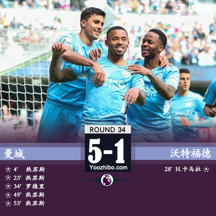 北京时间4月23日22:00,英超联赛第34轮,曼城主场迎战沃特福德。上半场比赛,热苏斯头顶脚踢梅开二度,卡马拉低射远角扳回一城,罗德里世界波破门。下半场比赛,热苏斯造点并亲自主罚命中,随后接到德布劳内横传推射入网完成大四喜。最终全场比赛结束,曼城5-1战胜沃特福德,继续排名积分榜首位。