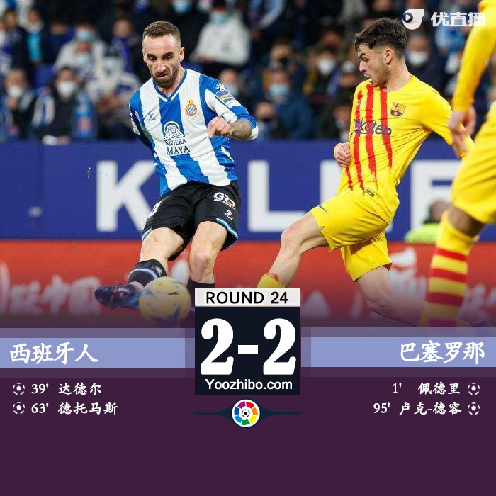 北京时间2月14日04:00,西甲第24轮,西班牙人主场面对巴塞罗那。上半场比赛,佩德里开场进球,达德尔远射扳平。半场战罢,双方1-1战平。下半场比赛,德托马斯反超比分,武磊替补未登场,皮克补时染红,L-德容补时绝平。最终全场比赛结束,巴萨2-2西班牙人,积39分升至积分榜第四。
