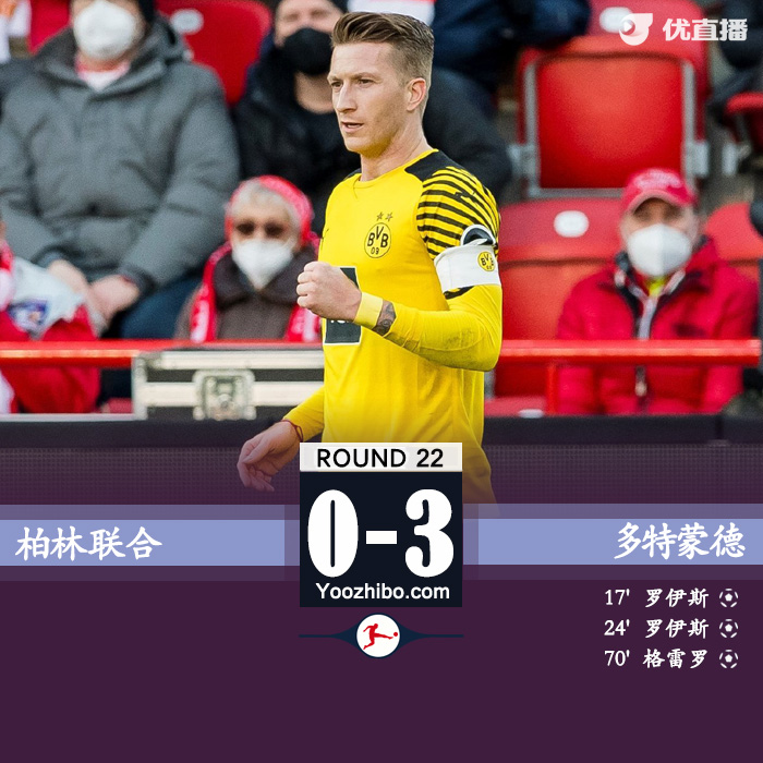 北京时间2月13日22:30,德甲联赛第22轮柏林联合主场迎战多特的比赛。上半场罗伊斯禁区低射建功,随后过掉门将破门梅开二度,半场多特客场2-0柏林联。下半场格雷罗补射建功,最终多特客场3比0大胜柏林联。