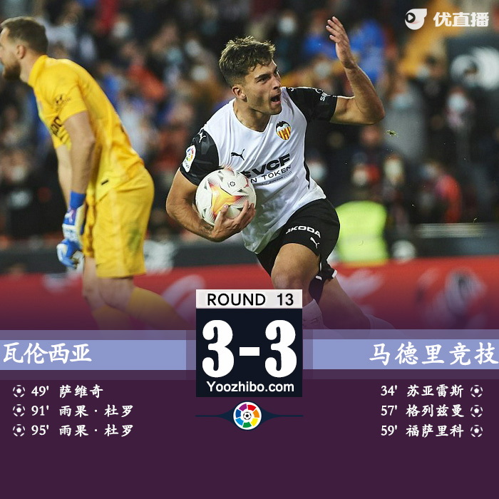 北京时间11月7日23点15分,西甲第13轮,马德里竞技客场挑战瓦伦西亚。上半场,特里皮尔伤退,苏亚雷斯破门。下半场,萨维奇不慎自摆乌龙,格列兹曼和福萨里科3分钟内连入两球,瓦斯射中门框,雨果杜罗替补登场在补时阶段连追两球完成绝平,全场比赛结束,马德里竞技3-3瓦伦西亚。