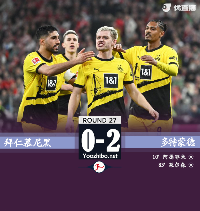 北京时间3月31日01:30,德甲第27轮迎来德国国家德比,拜仁慕尼黑坐镇主场慕尼黑安联球场迎战多特蒙德,本场主裁判为奥斯默斯。上半场,布兰特反击助攻阿德耶米小角度破门,凯恩失良机。下半场,阿莱助攻瑞尔森破门,凯恩扳回一城越位无效。最终,多特客场2-0力克拜仁,终结对阵拜仁连续11场不胜。