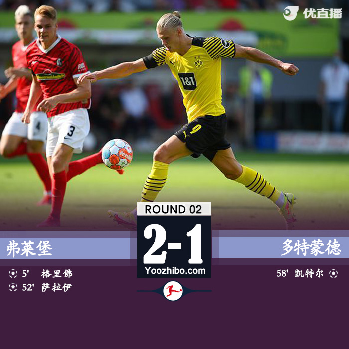 北京时间8月21日21:30,德甲第2轮,多特蒙德做客挑战弗赖堡。上半场,格里福任意球世界波直挂死角,贝林厄姆精彩突破造险后又头球中柱,郑优营门前失良机。下半场,萨莱凌空垫射扩大比分,帕斯拉克造蒂尔乌龙扳回一城。全场比赛结束,弗赖堡主场2-1击败多特蒙德。