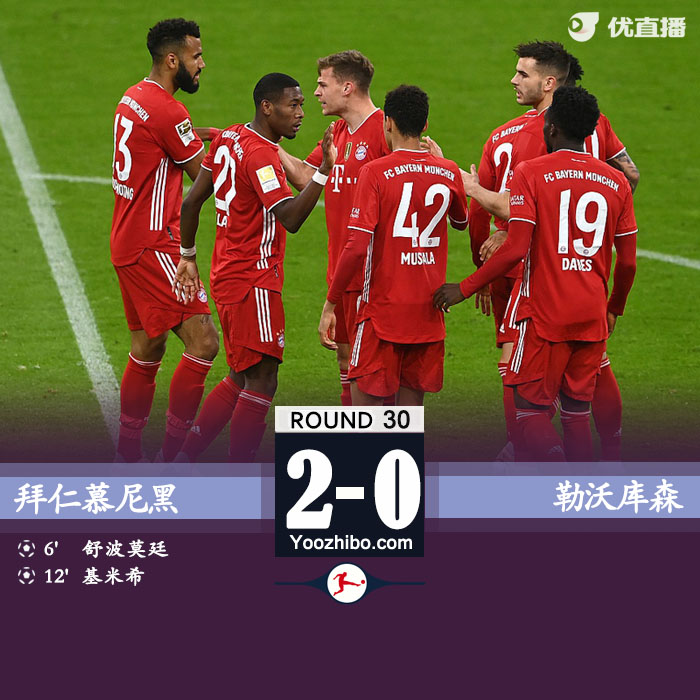 北京时间4月21日凌晨2时30分,2020-2021赛季德国甲级联赛第30轮上演一场焦点战役,拜仁慕尼黑坐镇安联球场迎战勒沃库森。上半场,舒波-莫廷破门首开纪录,基米希扩大领先优势。拜仁半场2-0领先勒沃库森。下半场,舒波-莫廷打进一球,但是被判罚越位在先,随后替补上场的贝拉拉比有一次射门击中横梁。最终拜仁慕尼黑主场2-0击败勒沃库森。本轮战罢,拜仁继续排名榜首,领先第二名10分,本赛季德甲还剩下4轮。