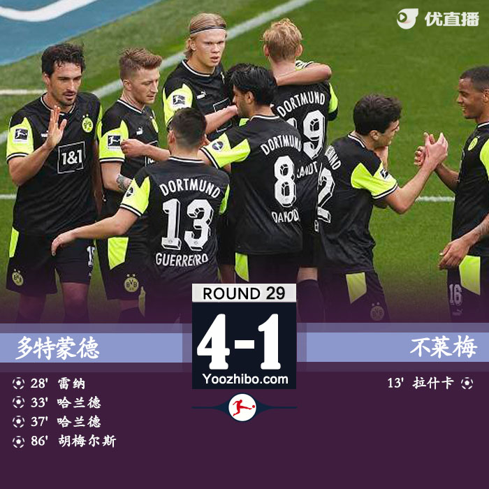 北京时间4月18日晚上21:30,2020-21赛季德甲第29轮,多特蒙德坐镇主场迎战不莱梅。上半场,拉希察单刀破门,雷纳爆射扳平比分,罗伊斯造点哈兰德主罚命中,哈兰德推空门得手。半场战罢,多特蒙德暂3-1不莱梅。下半场,罗伊斯屡造险,埃格斯泰因中柱,哈兰德头球破门越位,塞拉西乌龙。全场比赛结束,多特蒙德4-1不莱梅,本赛季双杀对手的同时,距欧冠区4分。