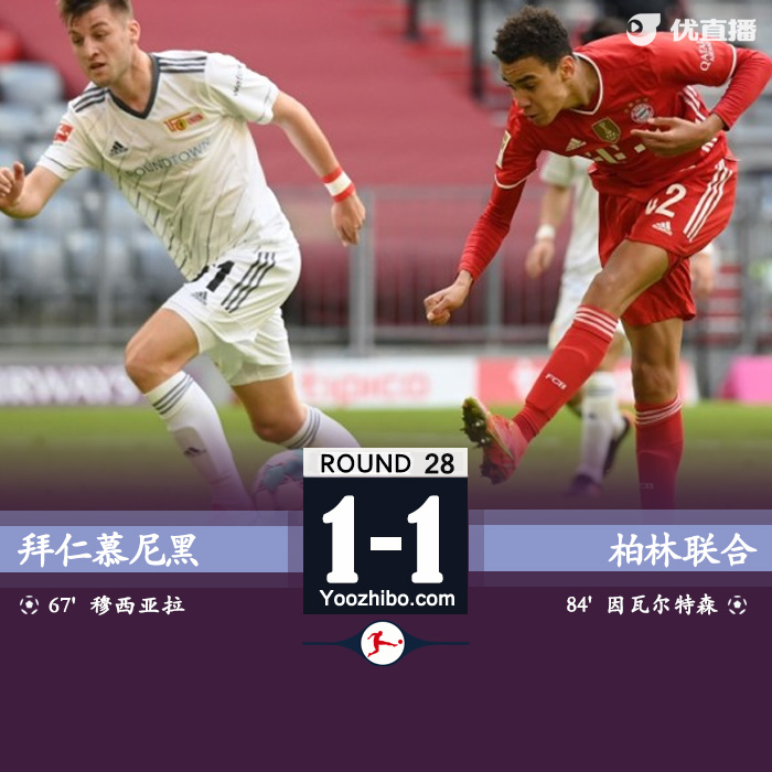 北京时间4月10日21:30,德甲联赛第28轮,拜仁慕尼黑主场迎战柏林联合。上半场比赛,穆西亚拉弧顶低射打偏,布特勒禁区内头球被诺伊尔没收。下半场比赛,穆西亚拉接到穆勒横传门前晃过后卫推射破门,因瓦尔特森抢点扳平比分。最终全场比赛结束,拜仁慕尼黑主场1-1与柏林联战平,由于另一场比赛莱比锡获胜,拜仁以5分优势暂时领跑积分榜。