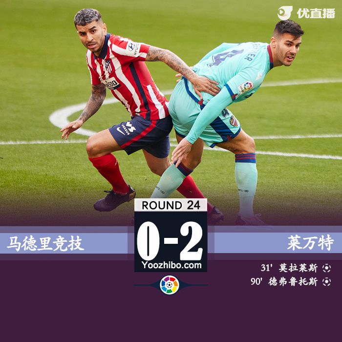 北京时间2月20日23:15,西甲第24轮,马德里竞技主场迎战莱万特。上半场,莫拉莱斯开场错失单刀后劲射破门;下半场,吉梅内斯伤退,苏亚雷斯任意球中柱,科雷亚进球被吹,德弗鲁托斯最后时刻半场远射破门。全场比赛结束,马竞0-2不敌莱万特,仍然以6分优势领跑。