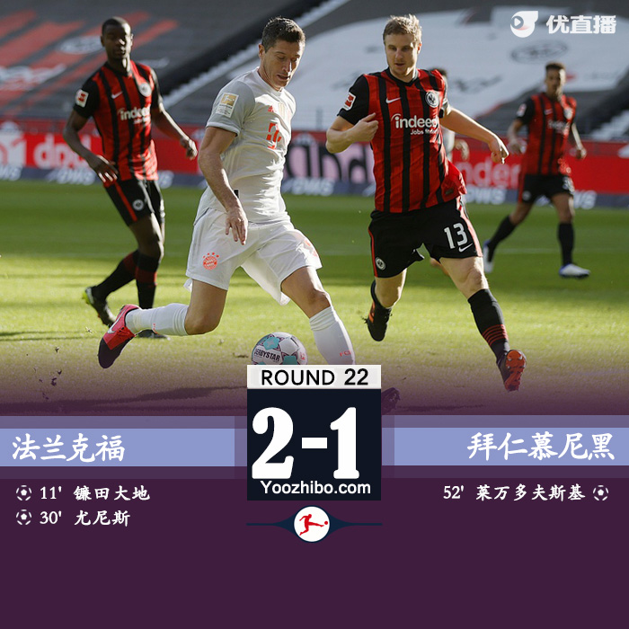 北京时间2021年2月20日22:30,2020-21赛季德甲第22轮,拜仁慕尼黑客场挑战法兰克福。上半时镰田大地先开纪录,随后尤尼斯世界波破门,边裁因伤换人。下半时萨内助攻莱万破门,科曼错失良机。最终,法兰克福2-1战胜拜仁,拜仁两轮联赛不胜。