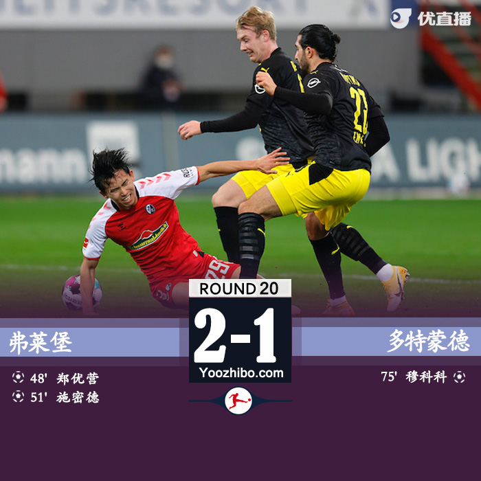 北京时间2月6日22:30,2020/21赛季德甲联赛第20轮比赛继续进行,弗莱堡坐镇主场迎战劲敌多特蒙德。上半场埃姆雷詹远射中框,下半场郑优营、施密德先后远射破门,穆科科替补建功。全场比赛结束,最终多特1-2不敌弗莱堡。