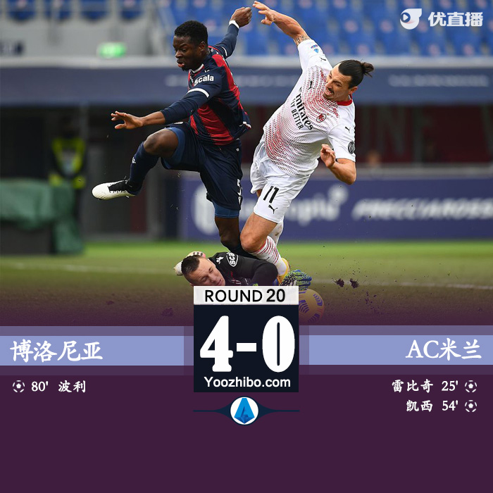 北京时间1月30日晚22点整,2020-21赛季意甲第20轮在内拉托-达拉亚球场展开角逐,AC米兰客场挑战博洛尼亚。上半场伊布失点,雷比奇补射建功,下半场凯西点射扩大比分,波利面对旧主破门。最终AC米兰客场2-1战胜博洛尼亚,米兰连续17个意甲客场不败刷新纪录。积分榜方面,米兰积46分继续领跑。