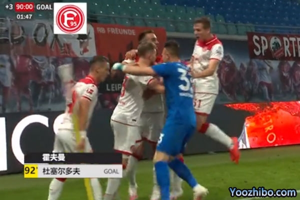 终场伤停补时阶段,杜塞尔多夫获得右侧角球,霍夫曼门前近距离接队友头球摆渡后头槌入网,杜塞尔多夫扳平比分,2-2!
