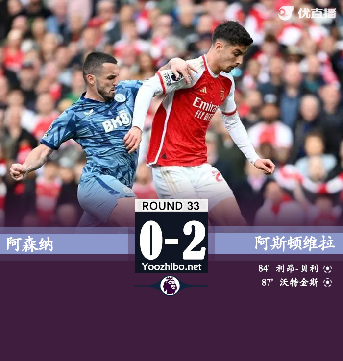 北京时间4月14日,英超联赛第33轮,阿森纳主场迎战阿斯顿维拉。上半场,哈弗茨打门被马丁内斯挡出,萨卡小角度爆射击中边网,沃特金斯断球低射中柱,特罗萨德近距离打门被马丁内斯神勇化解,萨卡内切兜射稍偏;下半场,蒂勒曼斯远射击中横梁后反弹中柱,热苏斯推射被扑,迪涅横传助攻贝利后点包抄破门打破僵局,若日尼奥传球失误后沃特金斯接长传单刀挑射入网。最终比分为阿森纳0-2阿斯顿维拉。