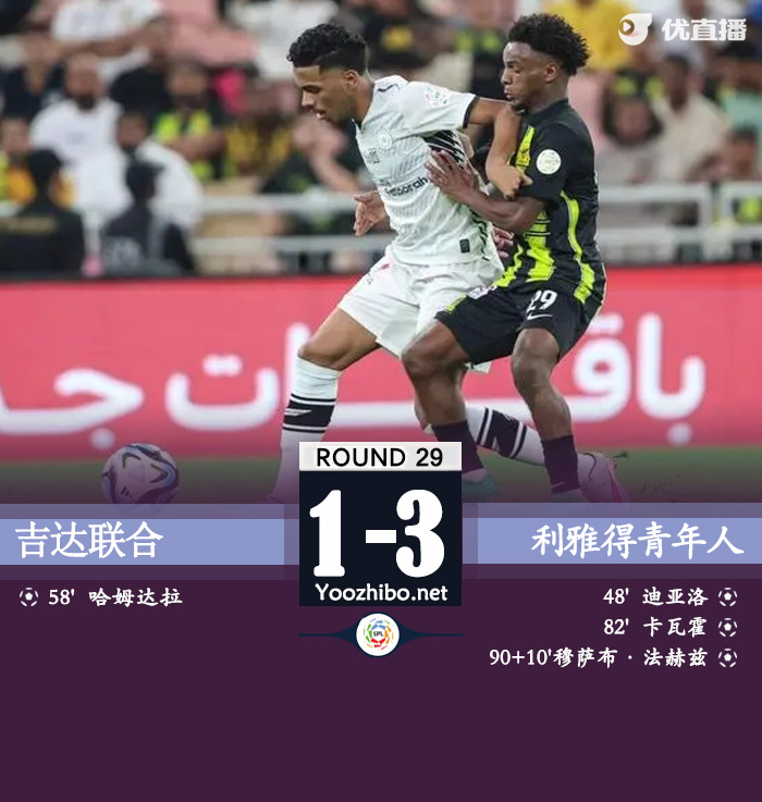 北京时间4月27日凌晨2时,沙特联第29轮,吉达联合主场迎战利雅得青年人,上半场,双方都未能把握住进球机会,互交白卷。半场战罢,吉达联合暂0-0利雅得青年人;下半场,卡拉斯科助攻迪亚洛破门,哈姆达头球破门扳平比分,替补登场的卡洛斯破门再次为利亚得青年人取得领先,补时最后时刻,阿尔朱维尔再入一球锁定胜局。全场比赛结束,吉达联合1-3利雅得青年人。
