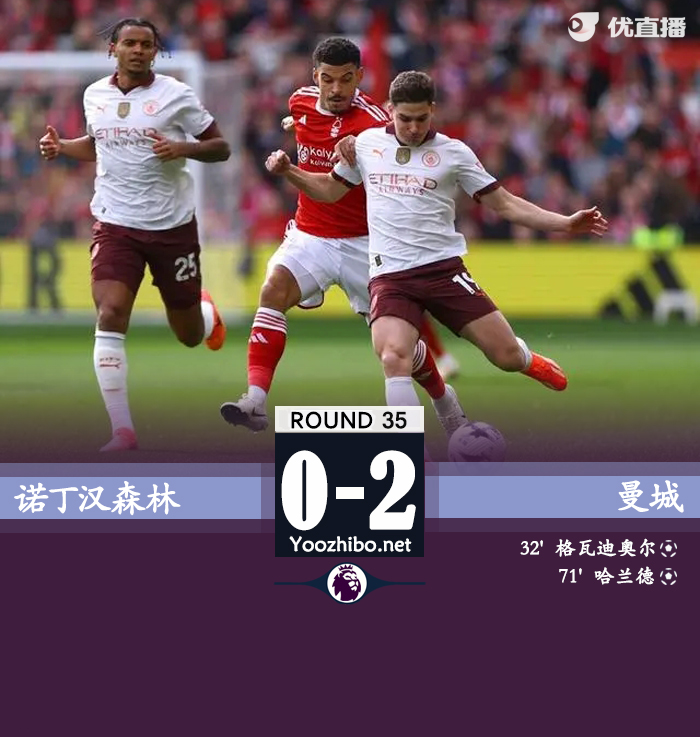 北京时间4月28日23:30,英超第35轮,曼城客战诺丁汉森林。上半场,德布劳内角球助攻,格瓦迪奥尔头球破门,伍德错失良机;下半场,格瓦迪奥尔门前送出关键解围,哈兰德伤愈复出替补登场打入一球。最终,曼城客场2-0击败诺丁汉森林,积79分位列积分榜第二位,少赛一场落后榜首的阿森纳1分,森林则积26分高出降级区1分。