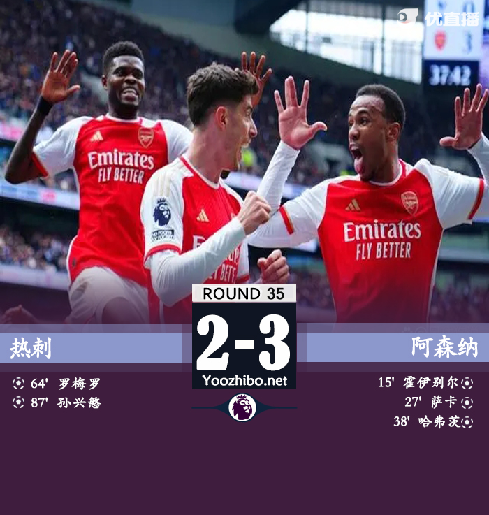 北京时间4月28日晚21时整,2023-24赛季英超第35轮北伦敦德比在新托特纳姆热刺球场展开角逐,热刺坐镇主场迎战阿森纳,上半场萨卡破门+造霍伊别尔乌龙,哈弗茨传射&近2场3球,下半场拉亚失误送礼,赖斯送点,罗梅罗和孙兴慜连扳两球。最终阿森纳客场3-2险胜热刺,枪手取得联赛3连胜,热刺遭遇两连败。积分榜方面,枪手多赛2场以4分优势领跑,热刺位居第5,少赛2轮落后前四名7分。