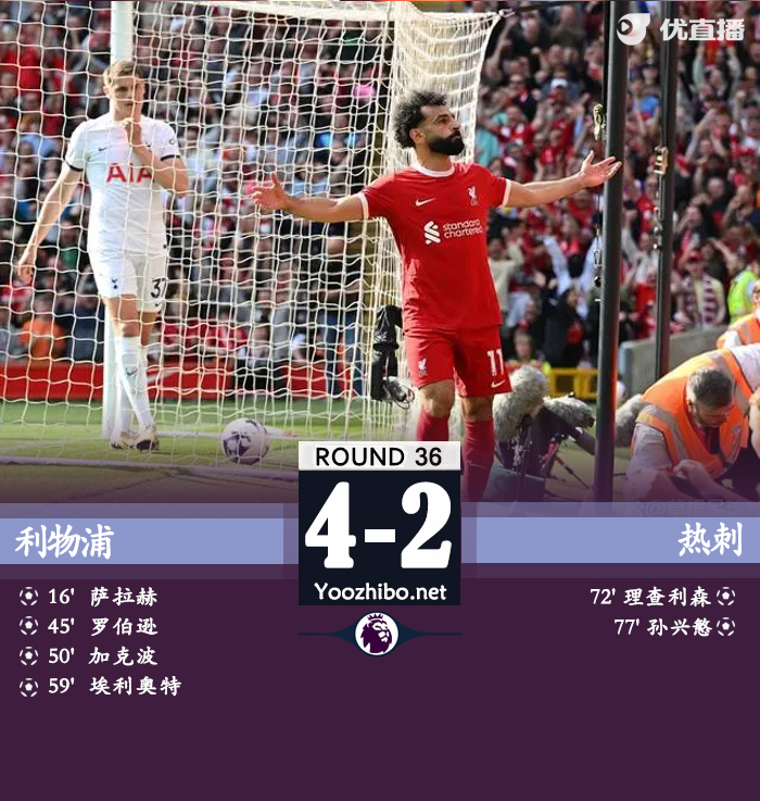 北京时间5月5日23:30,2023-24赛季英超联赛第36轮,利物浦坐镇安菲尔德球场迎战热刺。上半场加克波助攻萨拉赫破门,罗伯逊补射再下一城,利物浦暂2-0热刺;下半场埃利奥特传射,加克波进球,理查利森传射,孙兴慜破门,最终利物浦4-2热刺,距榜首5分。