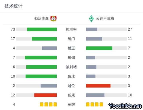 最终,勒沃库森0-2不敌不莱梅结束23轮不败。