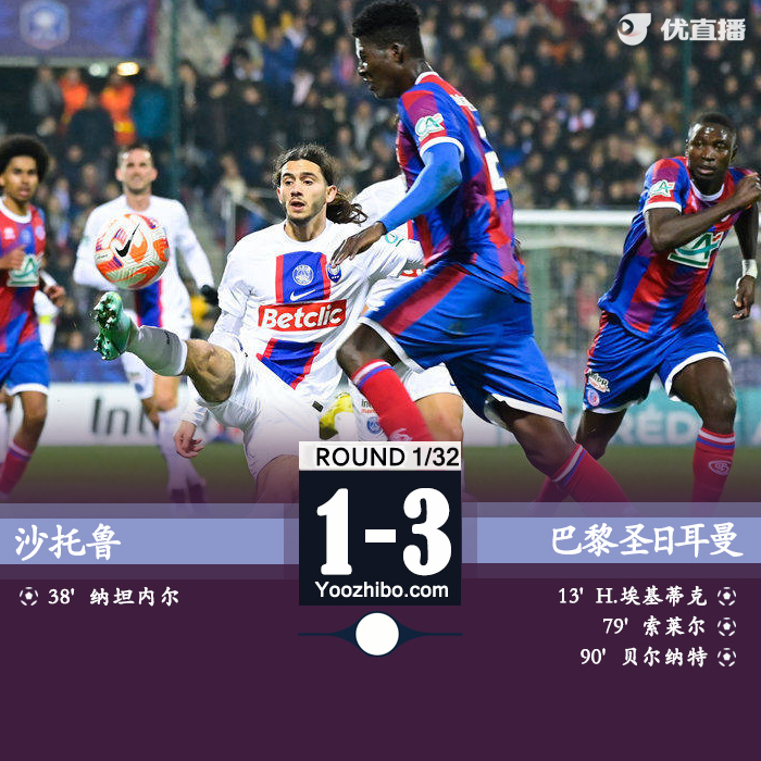 北京时间1月7日凌晨4:00,法国杯1/32决赛,沙托鲁对阵巴黎圣日耳曼。上半场,加尔比助攻埃基蒂克破门,恩托拉扳平比分。下半场,索莱尔破门再次为巴黎取得领先!巴黎圣日耳曼3-1沙托鲁晋级下一轮!