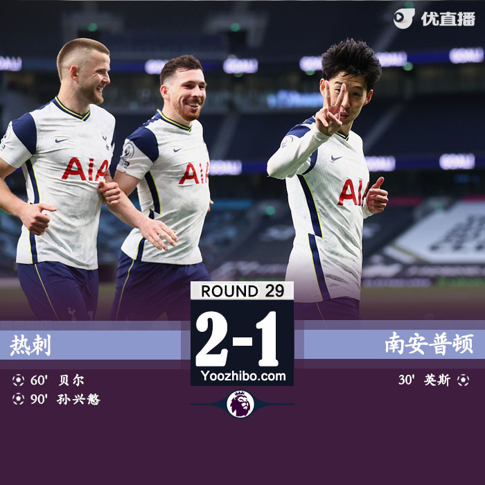 北京时间4月22日凌晨1时,2020-2021赛季英超联赛第29轮的一场补赛展开角逐,热刺坐镇主场迎战南安普顿。上半场,丹尼-英斯头球破门,南安普顿半场1-0领先热刺。下半场,贝尔扳平比分,随后孙兴慜点球破门完成绝杀。最终热刺主场2-1击败南安普顿。