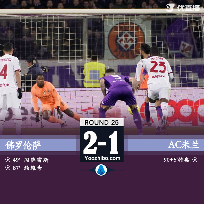 北京时间3月5日凌晨3:45,意甲第25轮,佛罗伦萨对阵AC米兰。上半场,托莫里门线解围,迈尼昂多次扑救力保球门不失;下半场,托莫里送点,冈萨雷斯点射首开纪录,约维奇头球破门扩大比分,补时阶段特奥爆射扳回一球。全场比赛结束,AC米兰1-2佛罗伦萨,四连胜被终结!