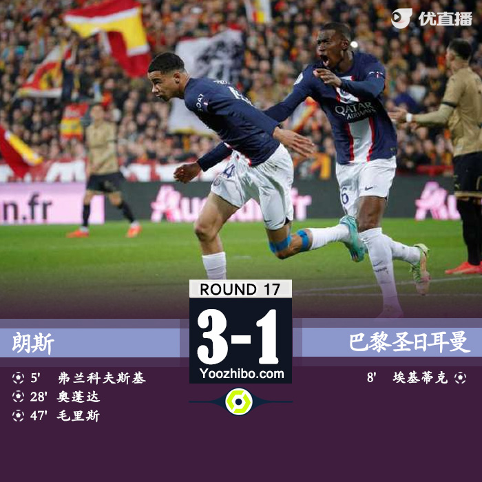 北京时间1月2日凌晨3:45,2022-23赛季法甲联赛第17轮,巴黎圣日耳曼客战朗斯。上半场弗兰科夫斯基破门,埃基蒂克闪电扳平,随后奥蓬达助朗斯再次领先;下半场奥蓬达助攻毛里斯进球,最终巴黎圣日耳曼1-3不敌朗斯,遭遇本赛季联赛首败。