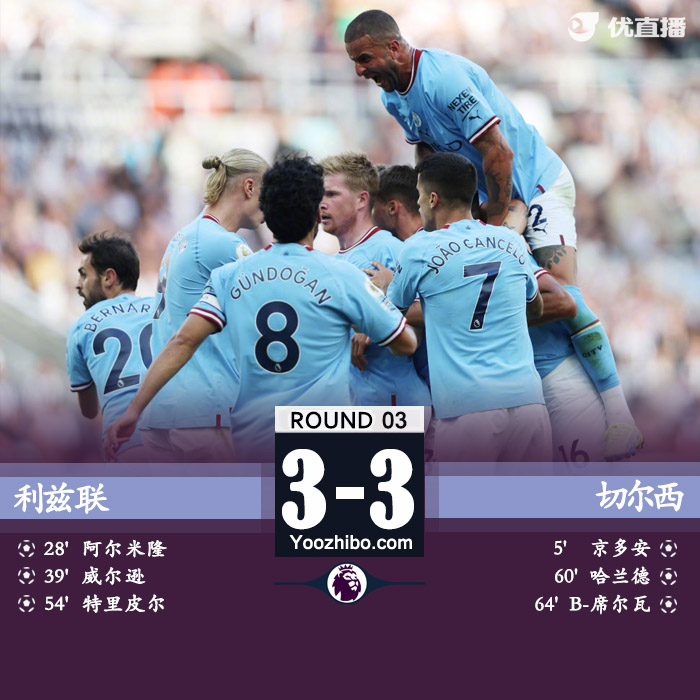 北京时间8月21日23点30分,英超第3轮曼城客场挑战纽卡斯尔。上半场,京多安闪击破门,曼城攻势占优,波普多次贡献扑救,阿克伤退,圣马连续助攻阿尔米隆和威尔逊完成反超。下半场,哈兰德中柱,特里皮尔任意球破门,哈兰德和B席先后进球将比分扳平,全场比赛结束,曼城3-3纽卡斯尔。
