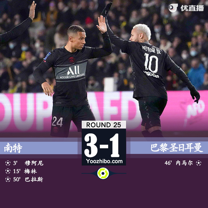 北京时间2月20日凌晨04:00,法甲第25轮继续进行,巴黎圣日耳曼客场挑战南特。上半场,穆阿尼和梅林连进两球,维纳尔杜姆送点,巴拉斯主罚命中帮南特3球领先。下半场,梅西助攻内马尔破门,姆巴佩制造点球内马尔主罚被拉冯直接没收。最终,巴黎1-3客场负于南特。