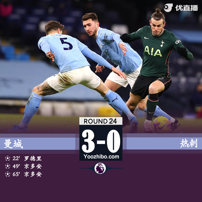 北京时间2月14日凌晨1点30分,2020-21赛季英超第24轮的焦点战在伊蒂哈德球场展开角逐,曼城坐镇主场迎战热刺。上半场凯恩任意球中框,罗德里点射打破僵局,下半场京多安梅开二度后伤退,埃德森献助攻。最终曼城主场3-0完胜热刺,蓝月亮豪取各项赛事16连胜,热刺近6场输掉5场。积分榜方面,曼城积53分继续领跑,热刺积36分位居第8名。