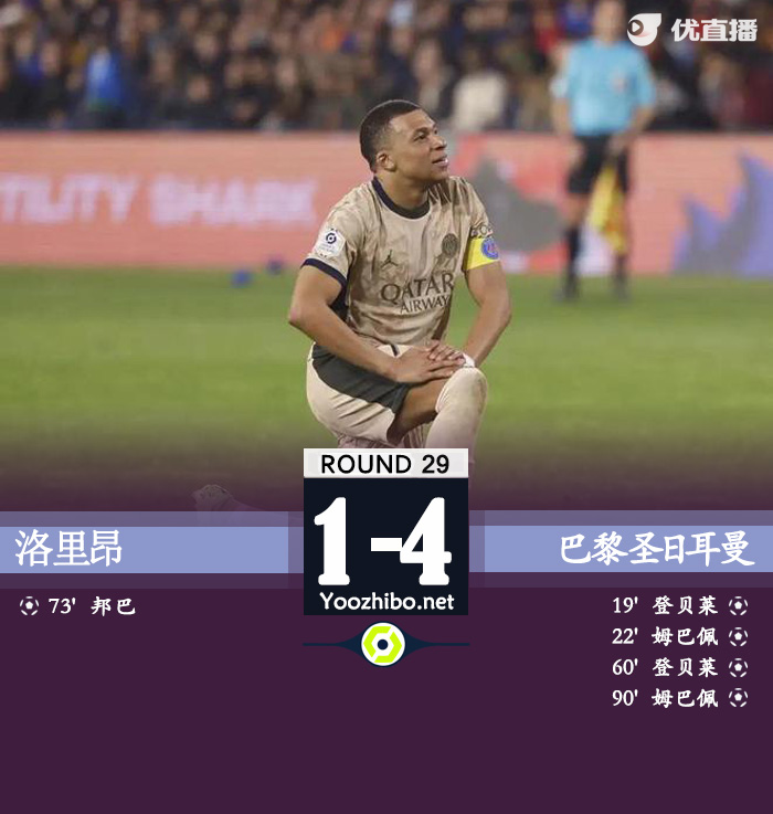 北京时间4月25日凌晨1:00,法甲第29轮,巴黎客场对阵洛里昂。上半场,登贝莱远射破门;姆巴佩左脚脚后跟建功。下半场,姆巴佩超强过人助攻登贝莱完成双响;邦巴扳回一球;最后阶段姆巴佩再入一球完成双响!最终,巴黎客场4-1击败洛里昂,若随后摩纳哥不胜,将直接夺得本赛季法甲冠军。