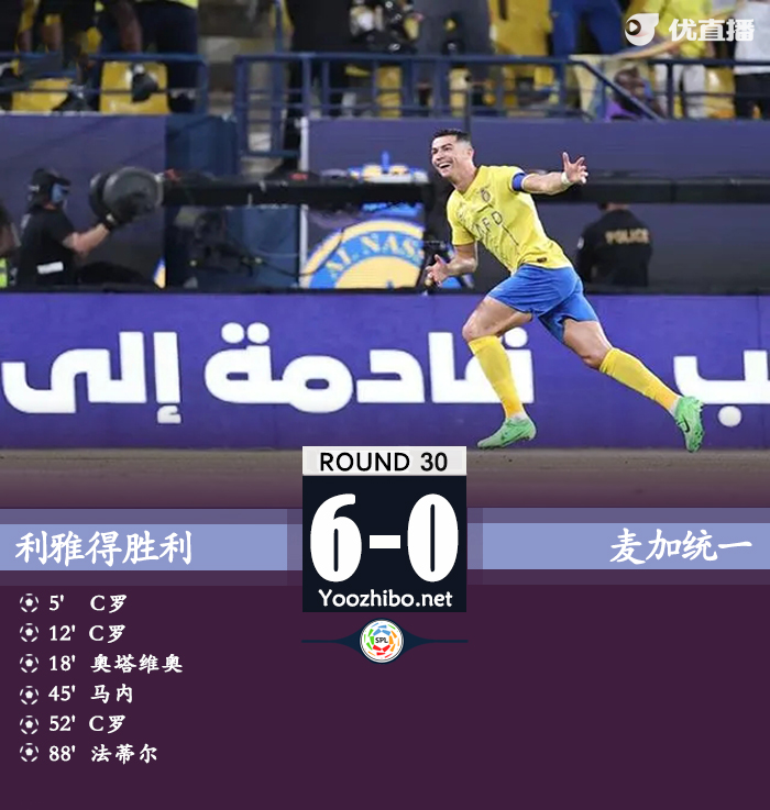 北京时间5月5日凌晨2时,沙特联第30轮,利雅得胜利主场对阵麦加统一。上半场,C罗八分钟内连入两球上演梅开二度,马内助攻奥塔维奥破门扩大比分优势,尾声阶段,奥塔维奥助攻马内再入一球。半场战罢,利雅得胜利暂4-0麦加统一;下半场,马内助攻C罗再入一球完成帽子戏法,法蒂尔最后时刻补射破门。全场比赛结束,利雅得胜利6-0麦加统一!