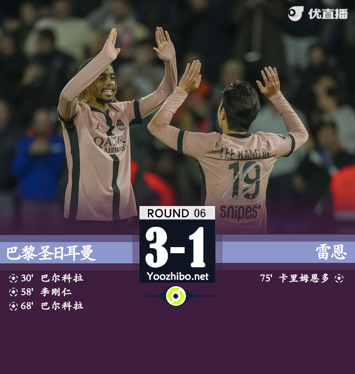 北京时间9月28日法甲第6轮巴黎圣日耳曼vs雷恩。上半场,马尔基尼奥斯开场破门越位微笑;巴尔科拉兜射破门。下半场,阿什拉夫进球同样越位无效;巴尔科拉兜射中柱,李刚仁补射空门得手;随后巴尔科拉再下一城!本场独造3球!贝拉尔多送点,卡里姆恩多点射破门。最终,巴黎3-1击败雷恩,6轮法甲狂轰20球!继续领跑积分榜。