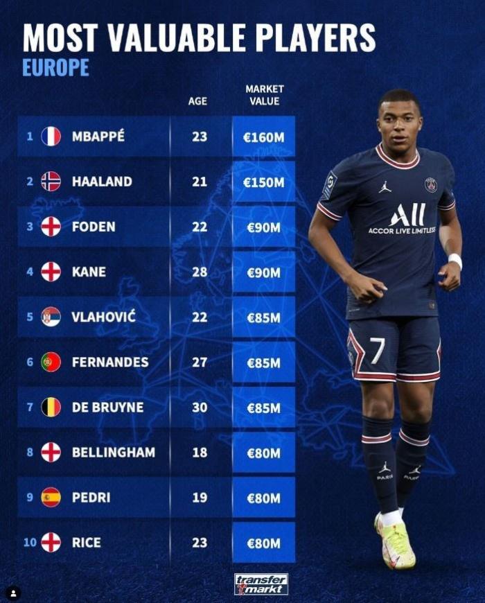 24直播网06月27日讯 今日,德转盘点欧洲的球员身价排行榜,前二分别是1.6亿欧的姆巴佩和1.5亿欧的哈兰德。